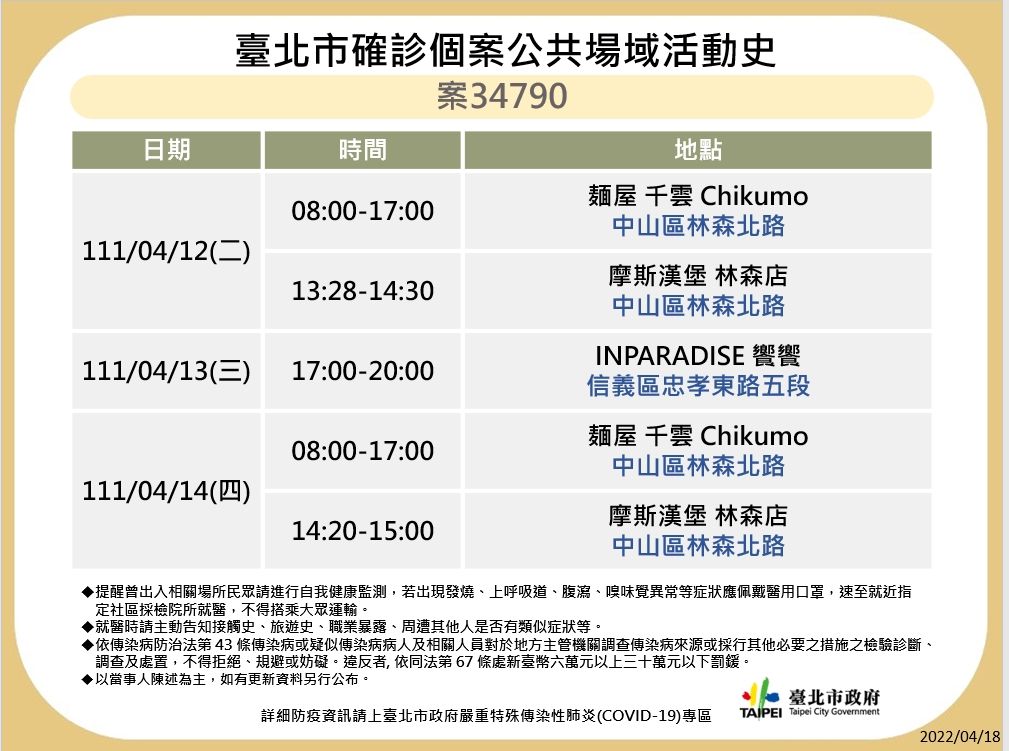 針對「案35371」足跡,台北市衛生局發言人紀玉秋接受《東森新媒體ETtoday》訪問時證實,個案為廠商請來的引導人員,並不會到演唱會座位區,平時區域較固定,只負責引導民眾上電扶梯等動線。