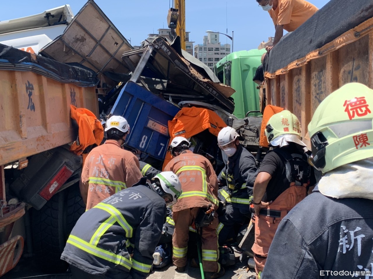 砂石車駕駛張姓男子,去年7月14日上午10時許,從從三重往八里方向準備下中華路匝道出口,卻未注意到前方車輛已經煞停,未保持安全距離先追撞2車後,將胡姓死者(37歲,男)駕駛的白色小貨車及另輛許姓男子駕駛的藍色小貨車撞向左側車道的砂石車,導致胡姓死者的小貨車被壓在底下、全車變形,上面還疊著被擠壓扭曲的藍色小貨車。