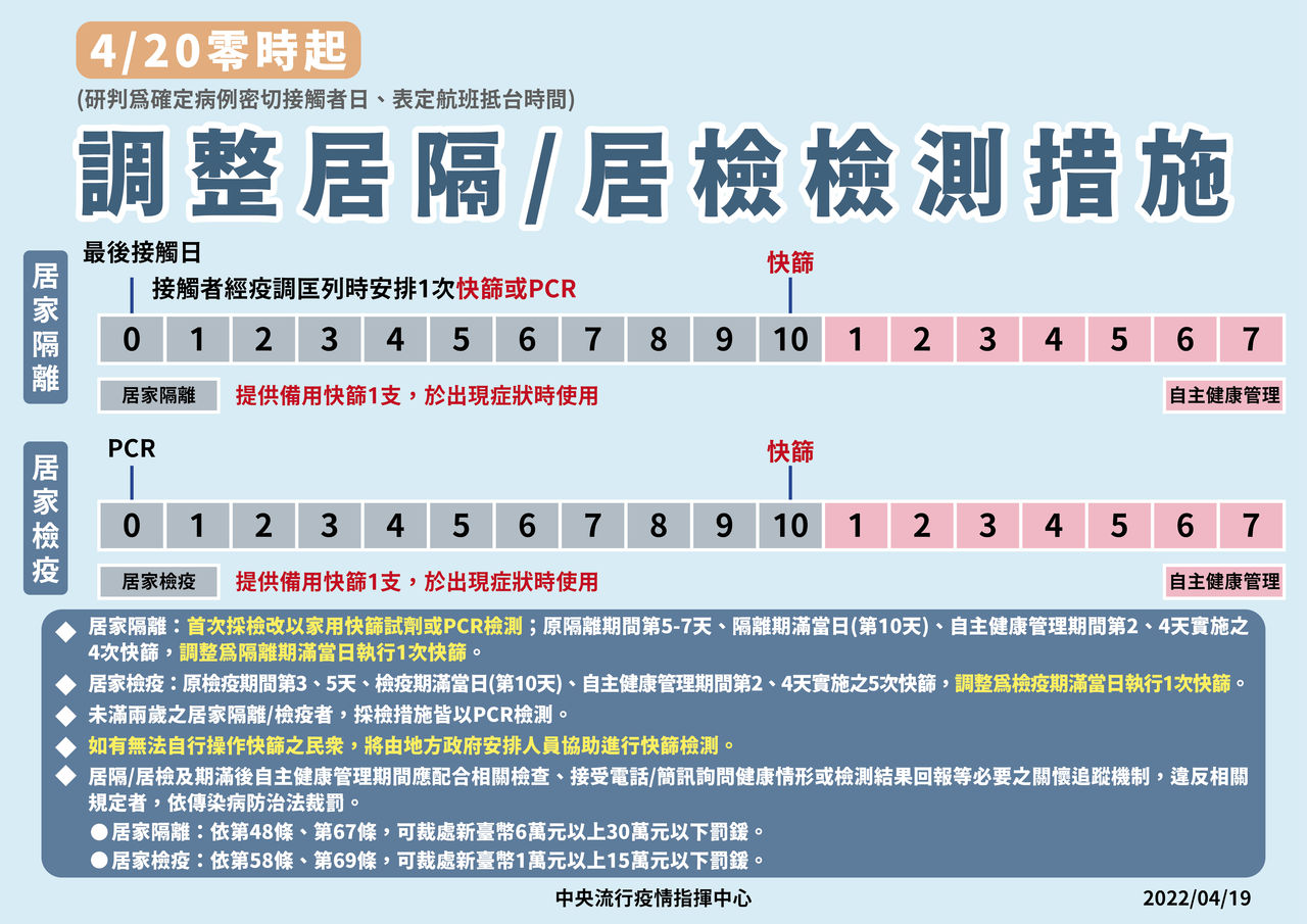 指揮中心說明,自今(2022)年4月20日零時起,研判為確定病例密切接觸者之居家隔離及表定航班抵臺時間入境之居家檢疫對象,其採檢措施調整如下: