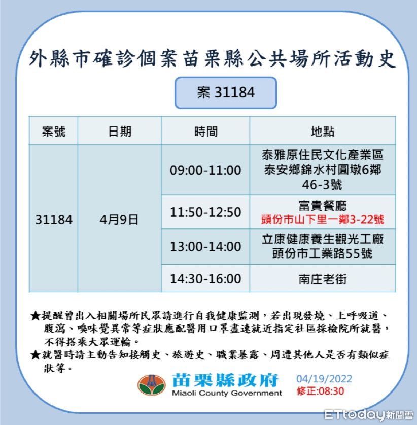 ▲苗栗縣政府公布疫調足跡。(圖/記者黃孟珍翻攝,下同)