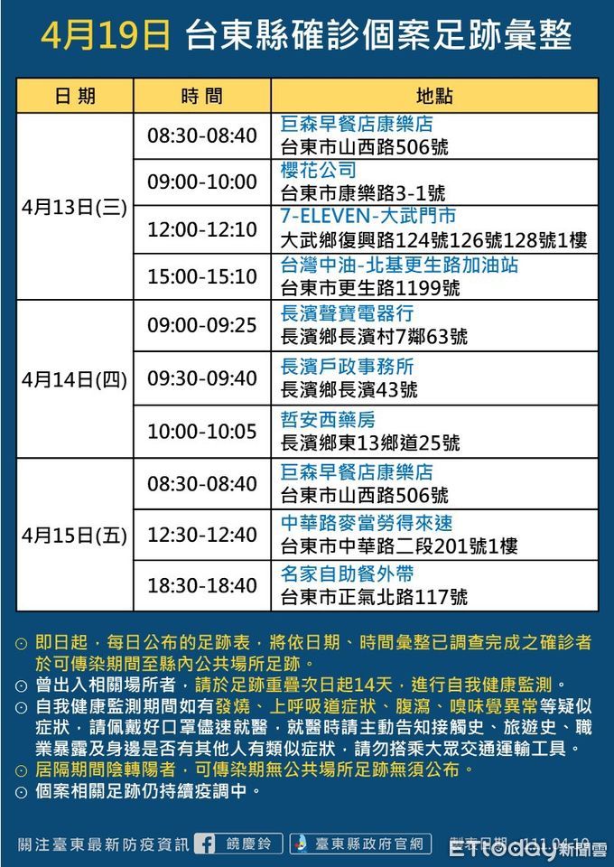 台東縣19日新增9名確診者,6位女性3位男性CT值分別介於14.1~34.1之間。其中多數與成功進香團有關連,且9名確診者中,有3名居隔期間陰轉陽,台東今年也累計到101名確診者。台東縣政府表示,成功國小及新港國中因有學生確診,且該校確診及匡列隔離班級已超過全校班級數1/3,依規定全校停課至4/22星期五。