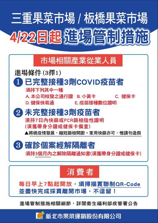 ▲三重、板橋果菜市場4月22日起實施進場管制措施。(圖/翻攝新北果菜臉書)