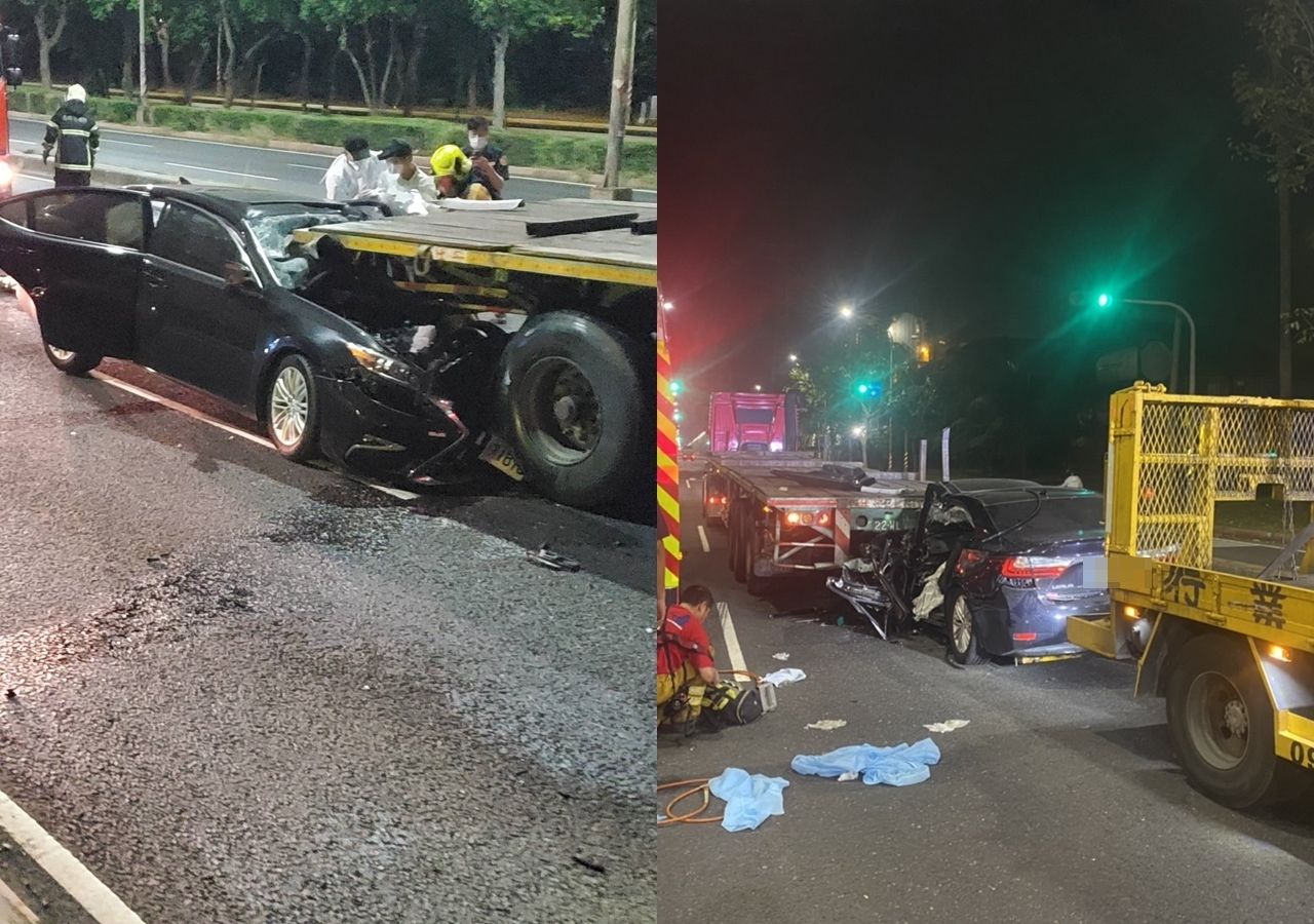 ▲高雄小港一輛轎車21日晚間追撞一輛正在等紅燈的曳引車。(圖/翻攝自記者爆料網)
