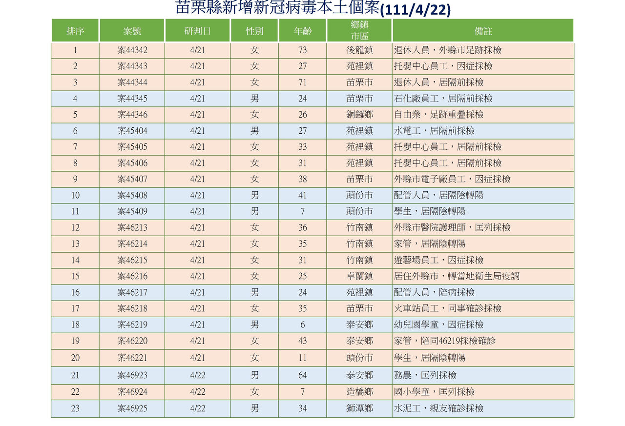 分別分布在10個鄉鎮市為苑裡鎮5例、苗栗市4例、頭份市3例、竹南例3例、泰安鄉3例、造橋鄉1例、銅鑼鄉1例、後龍鎮1例、卓蘭鎮1例、獅潭鄉1例,目前陸續依據中央指揮中心公告收治條件安排醫院、加強型防疫旅館或居家照護中。相關足跡如附件,所涉本縣公共場域足跡已完成清消,請鄉親安心,疫調持續進行中。
