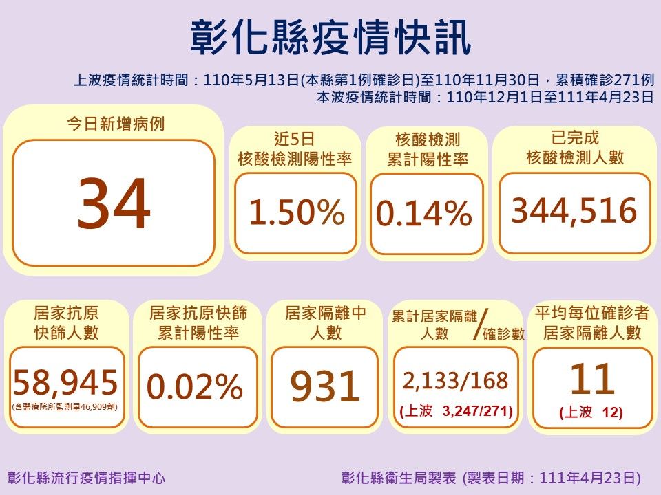 此外,外縣市感染4例、縣內感染個案8例、調查中有6例,王惠美說明,近5日核酸檢測陽性率為1.5%,核酸檢測累計陽性率為0.14%,已完成核酸檢測人數34萬4516人,居家抗原快篩人數5萬8945人,居家抗原快篩累計陽性率0.02%,居家隔離中人數931人,累計居家隔離人數2133人,確診數168人,平均每個確診者居家隔離人數11人,防疫仍不能鬆懈,民眾仍要落實防疫,一起守護健康家園。