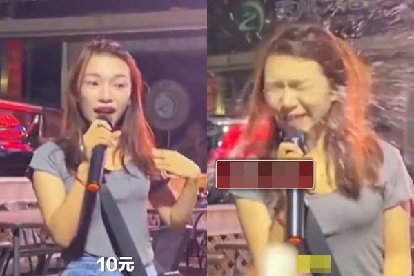 綜合陸媒報導,這段影片近期在網路上流傳,身穿灰衣、拿著麥克風,還背著音響的長髮女子走到桌邊,想詢問顧客是否有要點歌,竟然有名白衣男子拿起酒杯,朝女子臉上潑灑,嚇得女子當場愣住。