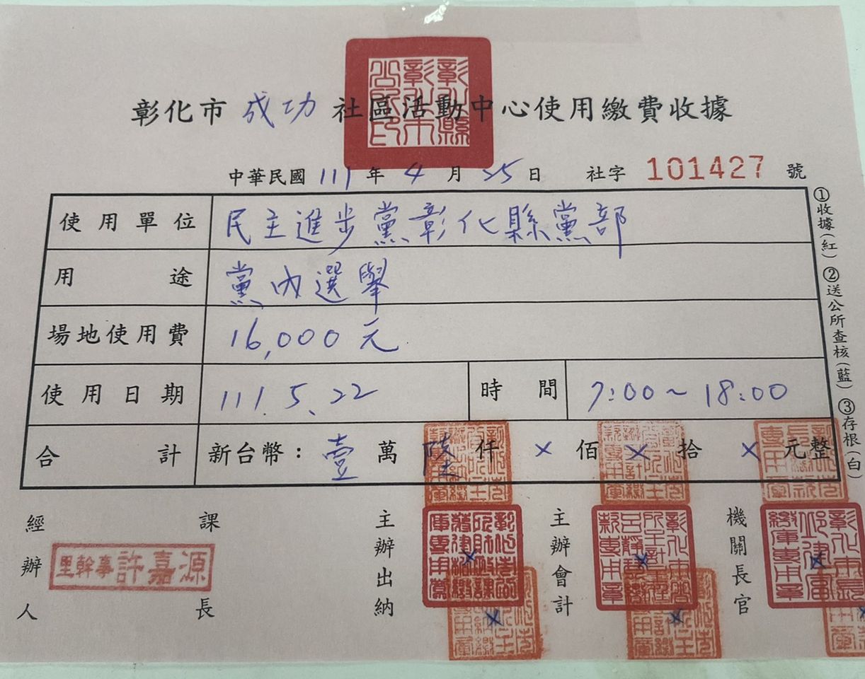 彰化縣民進黨職改選於5月22日登場,北彰化投票所原定在彰化市忠孝國小內舉行,因應疫情持續持續延燒,民進黨彰化縣黨部決定緊急商借彰化市旭光路成功社區活動中心,今早已完成繳交費用等等相關申借程序。