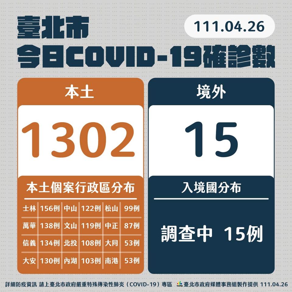 台北市26日新增1302例本土,分別居住於士林區156例、萬華區138例、信義區134例、大安區130例、中山區122例、文山區119例、北投區108例、內湖區103例、松山區99例、中正區87例、大同區及南港區各53例。