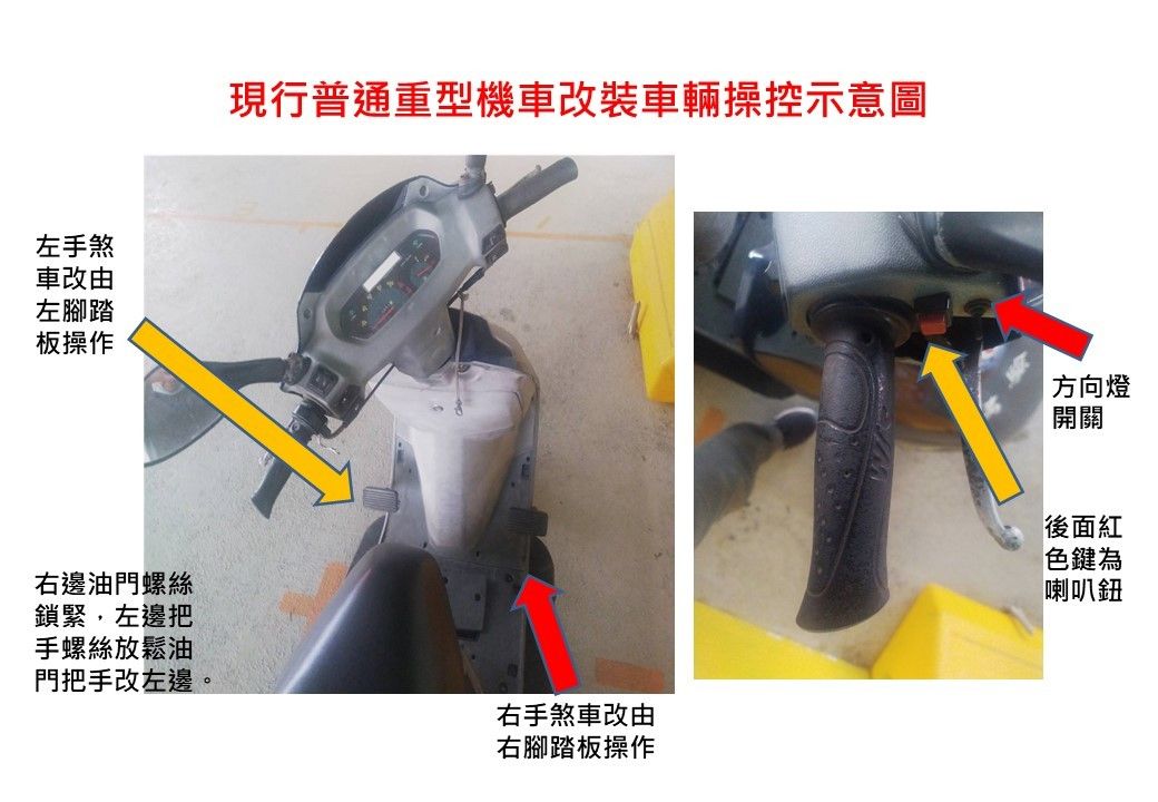 ▲現行普通重型機車改裝車輛操控示意圖。(圖/交通部)