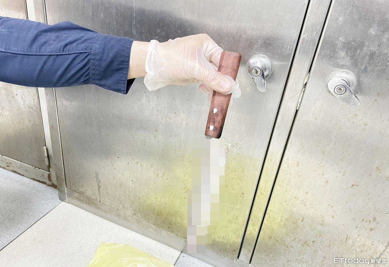 ▲桃園市甘姓女子22日晚間返回前夫家,疑因酒意與許姓前夫起口角,甘女持水果刀一刀刺殺前夫右後頸,平鎮警方在現場起出做案用水果刀等證物。(圖/記者沈繼昌翻攝)