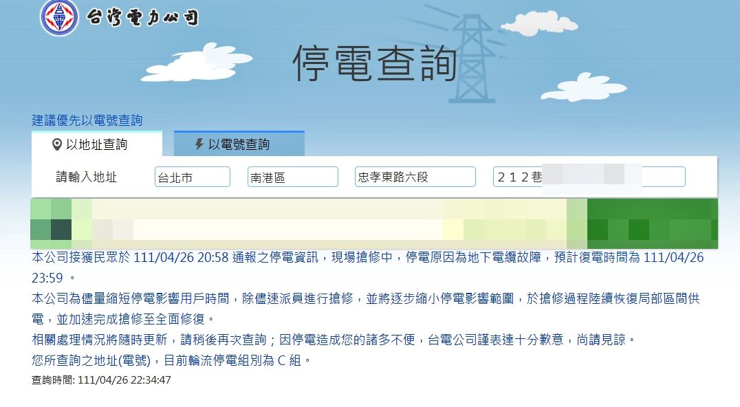 對此,台電表示,中研變電所26日晚間8時33分因為地下電纜故障,導致饋線分歧跳脫,進而造成南港區忠孝東路六段、東新街一帶共1001戶停電,目前已經派人持續搶修中,預計復電時間為晚間11點59分。