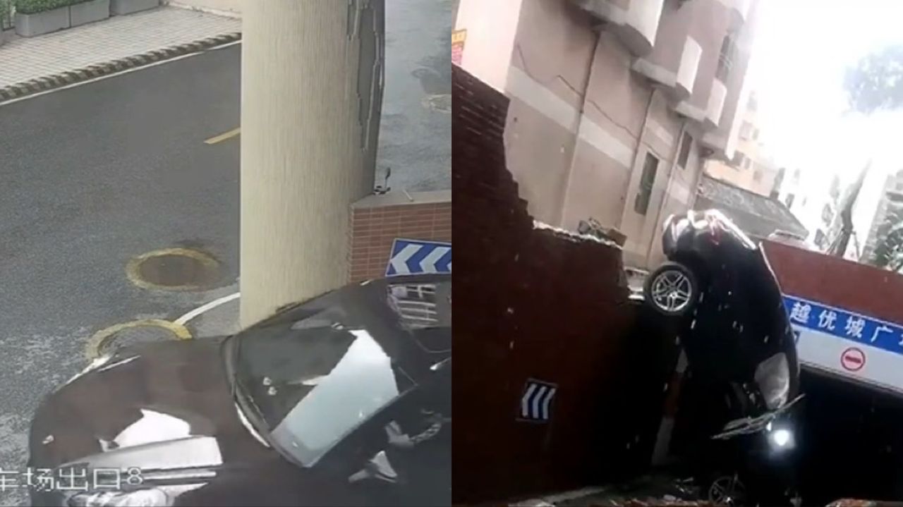 廣東省佛山市一名女子24日下午開著保時捷離開停車場,沒想到才剛彎出出口,她竟誤將油門當剎車踩,直接衝破圍牆掉落至停車場的車道,場面相當驚人,所幸無人傷亡。