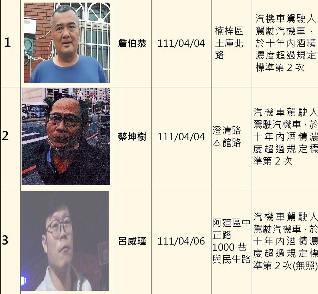 ▲▼高雄公告酒駕累犯全名照片。(圖/高雄市交通局提供)