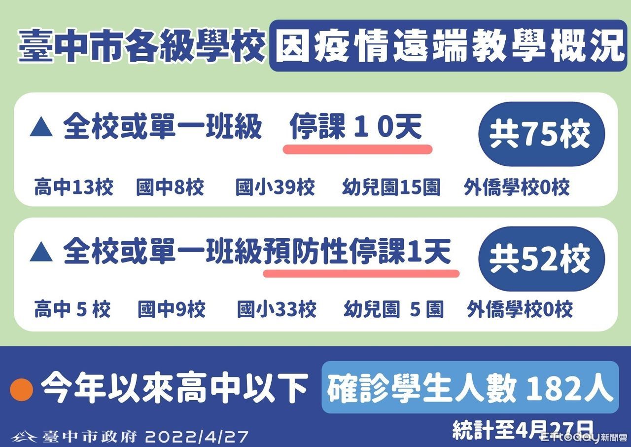 台中27日本土新增確診個案突破300例續創新高,台中市共75校全校或單一班級停課十天遠端教學,52校全校或單一班級預防性停課1天,今年來累計有182學生確診,光是本周一到周三就增加50名學生確診、23校停班課。