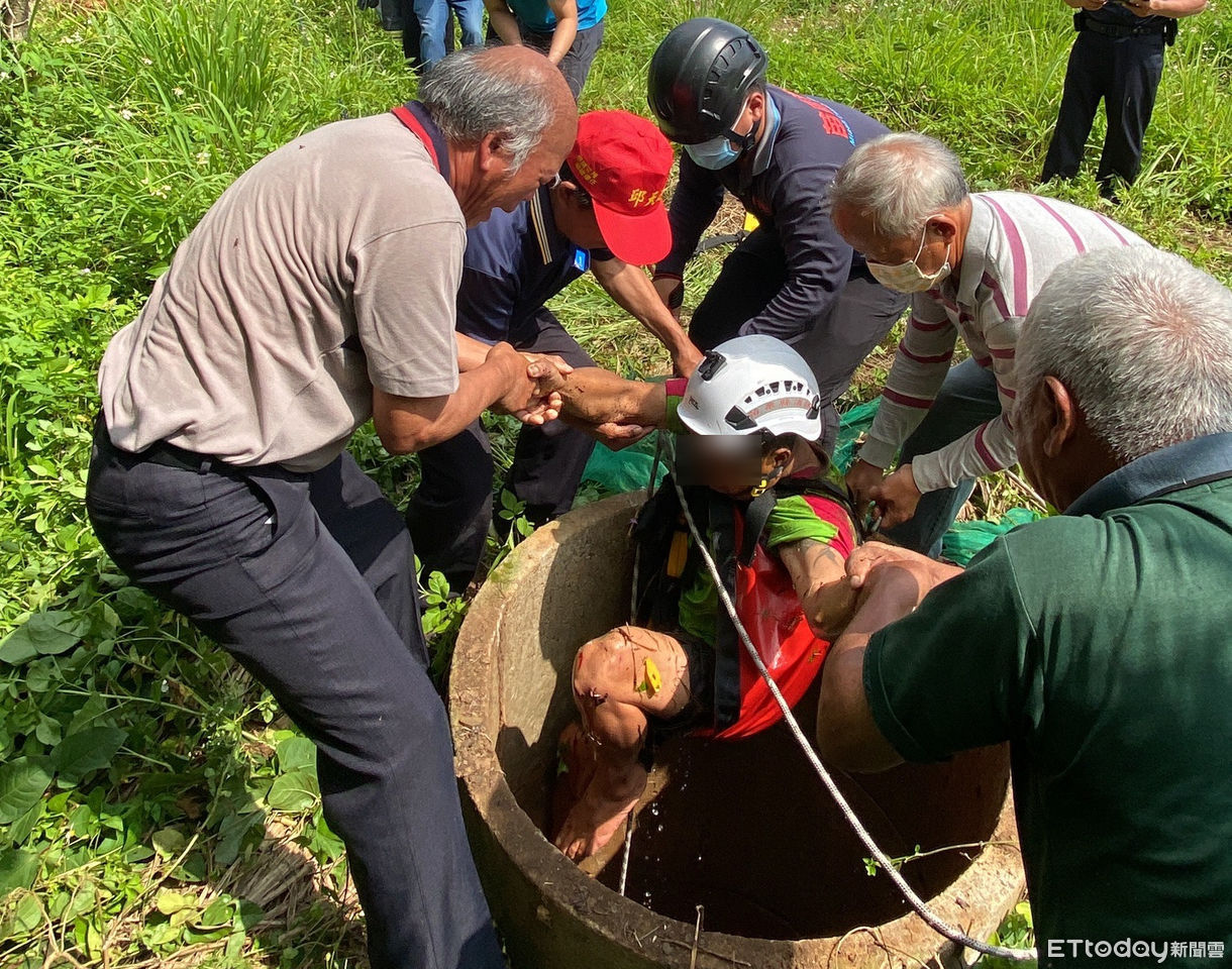 ▲邱男到通霄鎮內一處古井準備取水時,不慎摔落10米深井裡,經救援人員用繩索吊掛上來後,男子雙腿骨折送醫救治。(圖/記者黃孟珍翻攝,下同)