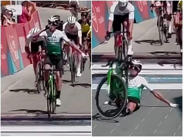 根據《每日郵報》報導,希臘27日舉行「Tour of Hellas」第一輪賽事,影片中可見,西班牙車手34歲普拉德斯在終點前保持領先,信心滿滿地親吻自己的右手,接著高舉雙臂,準備衝過終線,場邊的觀眾也為他歡呼。結果在最風光的一刻,他卻重心不穩,屁股向後滑出椅墊,慘摔在地。所幸,後方車手並未追撞上來,也有選手完賽後下車幫助他。