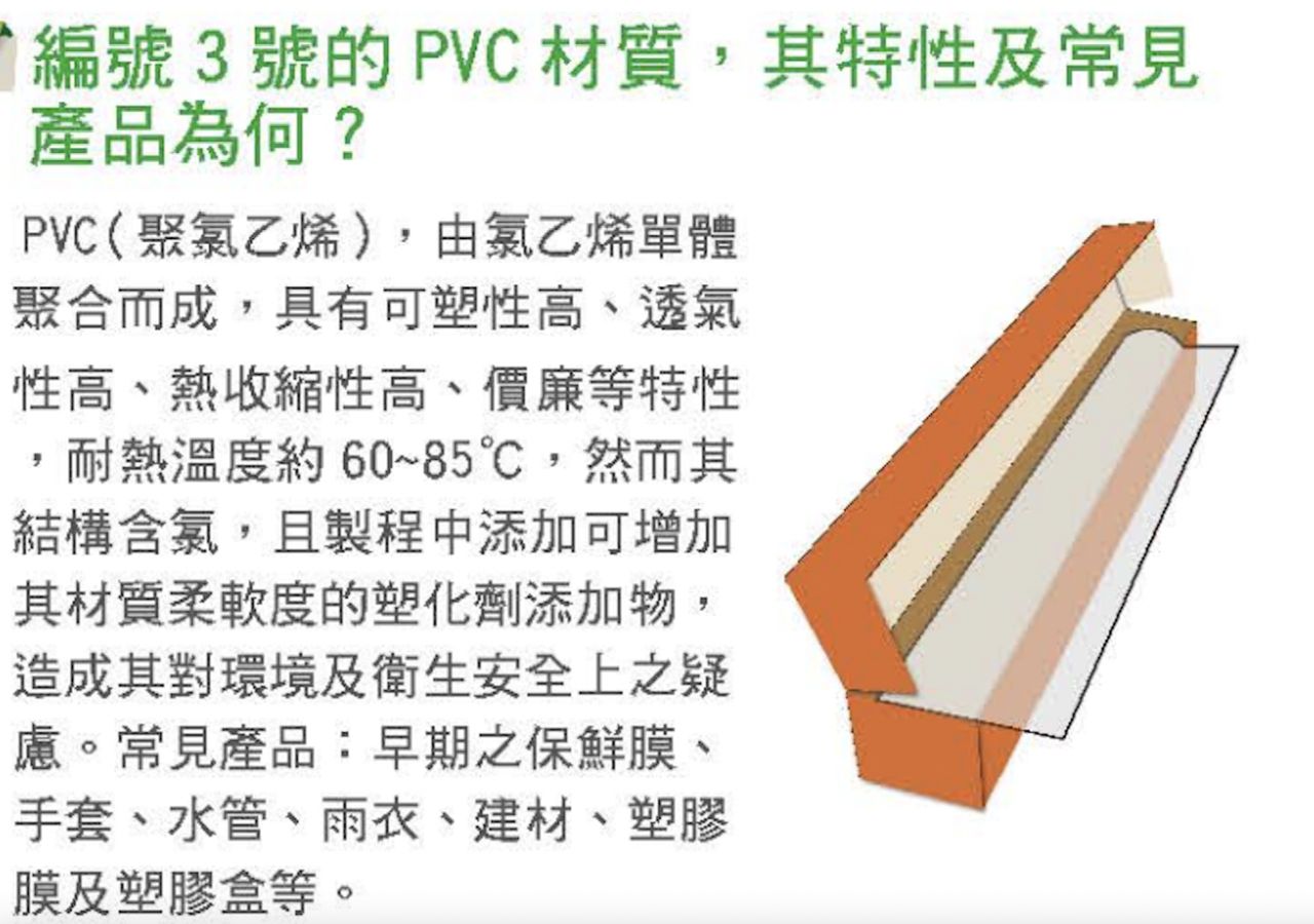 環保署回收基管會執行秘書王嶽斌說明,含PVC的塑膠包裝,氣密性比較好,常見在一些含乳製品包裝上,其實已經慢慢減少了,因為此材質特性,可能添加安定劑,對人體健康有一定影響,又不抗油的溶解腐蝕,有塑化劑滲入食品的可能,所以暴露在PVC條件下,對人體健康有環境賀爾蒙的影響及致癌風險。