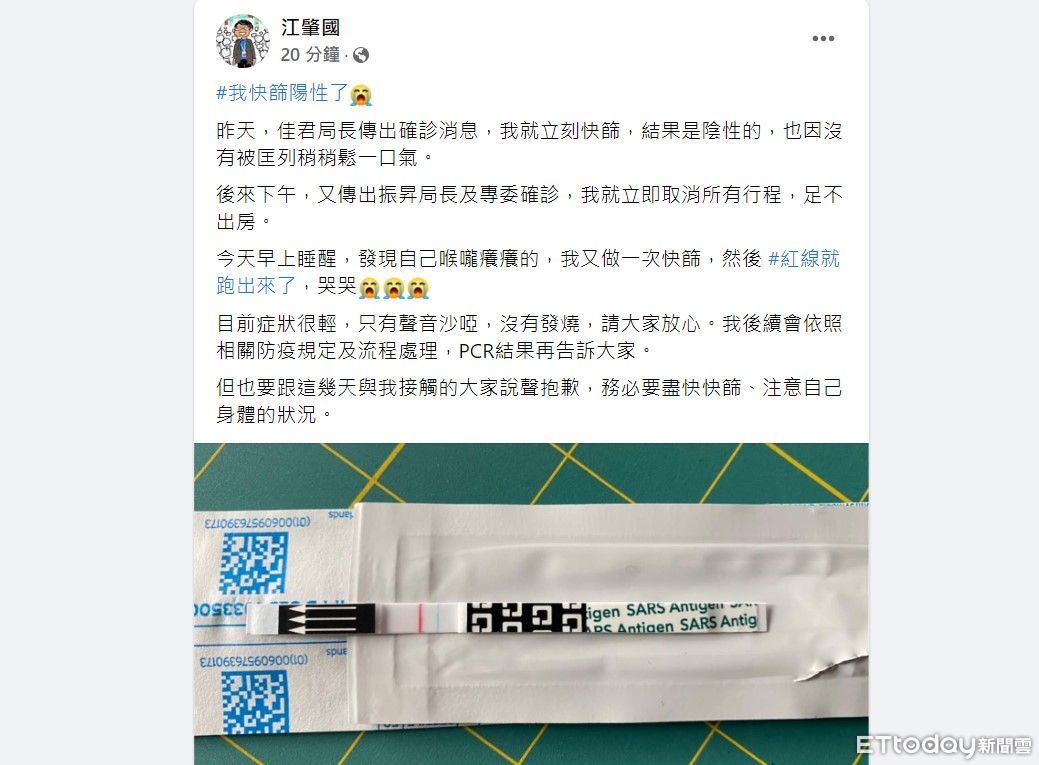 江肇國貼文指出,昨天文化局長陳佳君傳出確診消息,自己就立刻快篩,結果是陰性的,也因沒有被匡列稍稍鬆一口氣。後來下午,又傳出教育局長楊振昇及專委確診,就立即取消所有行程,足不出房。但今天早上睡醒,發現自己喉嚨癢癢的,又做一次快篩結果為陽性。