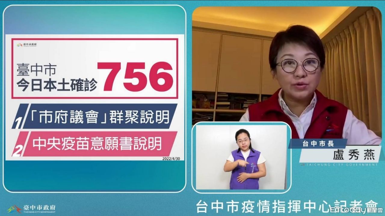 全國今(30)日本土確診新增1萬5033例,台中市本土個案新增756例,再創新高。市長盧秀燕表示,台中市政府和議會群聚案,4月26日參加市府和議會的餐會人員共24名,全員已快篩,截至今日中午,18位快篩陰性、6位快篩陽性,PCR結果也都確診,包含文化局長陳佳君、教育局長楊振昇及包含文化局長陳佳君、教育局長楊振昇及2位議員江肇國、王立任、一名專委還有議會公關室主任,呼籲接觸者若後續有症狀可再篩驗,若為陽性,請通知防疫單位。