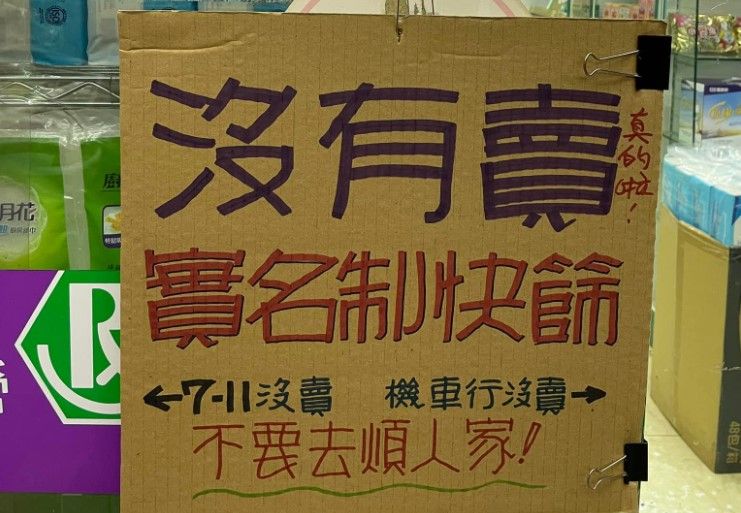 本土疫情不斷延燒,居隔人數瞬間暴增,自26日開始居隔3+4新制,快篩試劑的需求也隨之高漲,目前各地藥局開始實施快篩實名制,不過許多店家幾乎都是一開門就賣完,有網友經過一間藥局,門口貼著大大的2張公告「快篩賣完了」,還要民眾不要去煩隔壁的店家,讓網友笑翻,超美的手繪字也獲得大讚。