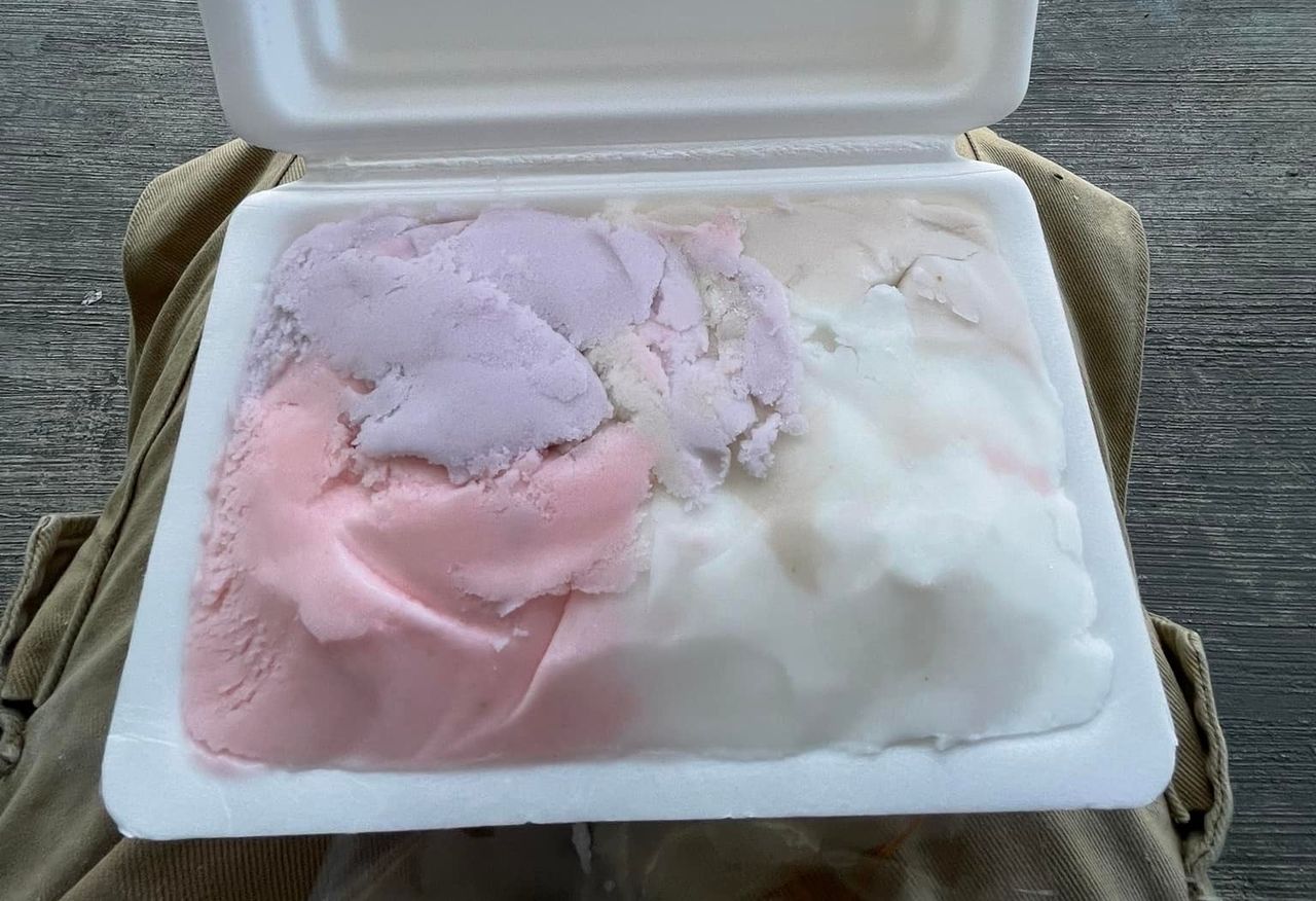 原PO在臉書社團「爆廢公社」貼出照片,從中可見他花50元買了一大盒冰淇淋,裡面裝有紫色、白色及粉紅色3種口味的冰淇淋,讓他直呼「吃到撐」;另一張照片則顯示,店面放有刨冰機、製冰捅等,勾起不少人小時候的回憶。