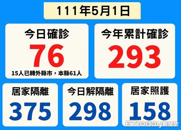 衛生局表示,今日確診個案中有1家5人確診,該家庭成員第1個通報個案為3歲女童,未達新冠疫苗接種年齡,4月28日出現咳嗽、流鼻水,4月28日至4月29日反覆發燒,4月29日至診所就醫,昨至醫院採檢PCR陽性,CT值11.7。經衛生局疫調匡列密切接觸者名單時,發現本案家庭感染來源,阿嬤才是全家最早有症狀,但因阿嬤自認為是一般感冒症狀,所以自行購買成藥,後因孫女確診才自行快篩陽性。