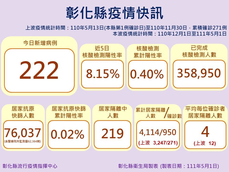 彰化縣5月1日舉行防疫記者會,縣長王惠美表示,彰化縣今天新增222例,I例未列案號,防疫仍不能鬆懈,近5日核酸檢測陽性率為8.15%,核酸檢測累計陽性率為0.40%,居家隔離中人數219人,累計居家隔離人數4,114人,確診數950人,平均每位確診者居家隔離人數4人,王惠美表示,這波疫情確診個案年齡分布,確診個案以青壯年族群最多,占6-7成,其中,18歲以下確診個案為25.7%,65歲以上確診個案為7%。