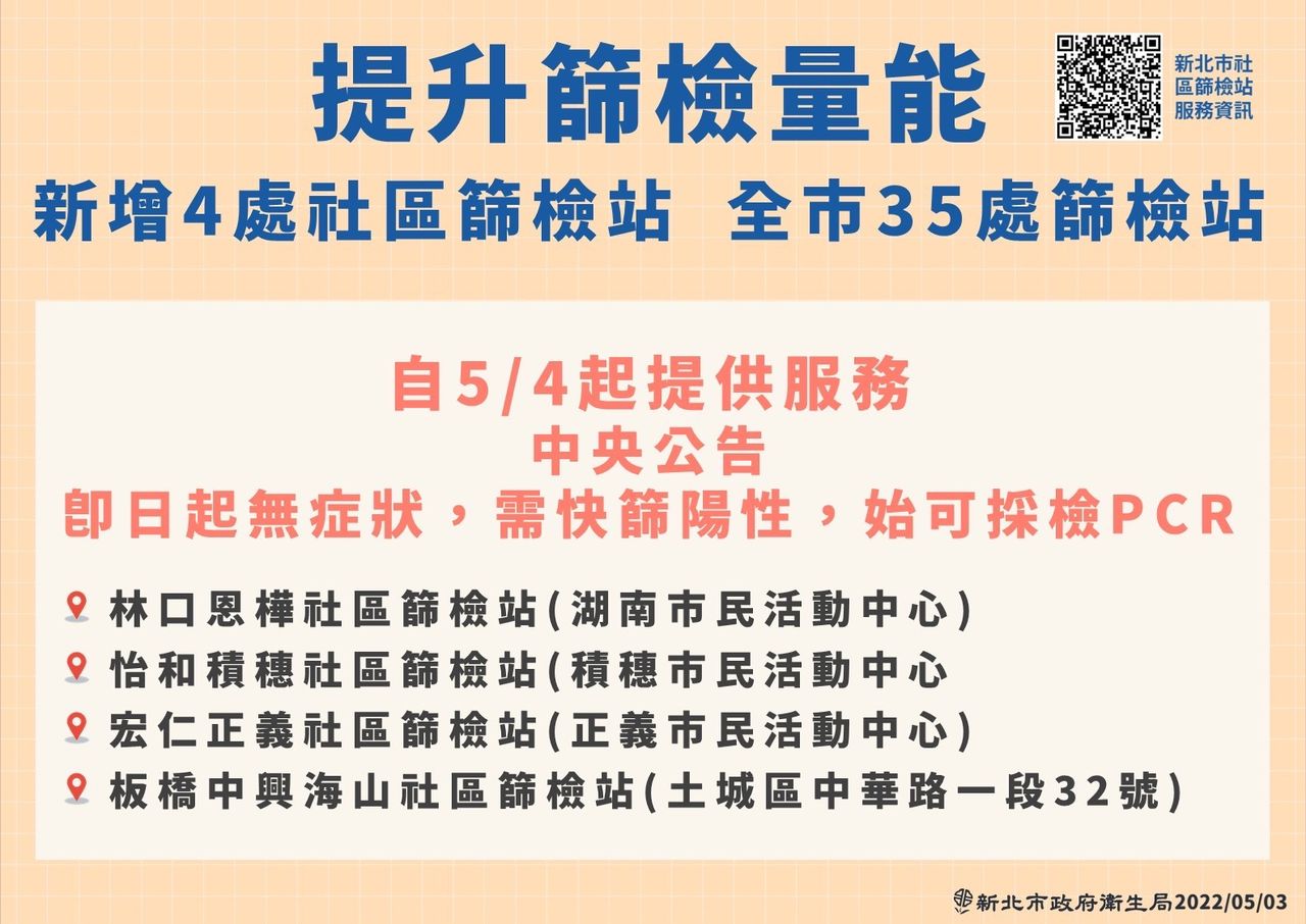 根據新北市衛生局提供的資訊,新設立的4個篩檢站,分別是林口恩樺社區篩站(湖南市民活動中心)、中和怡和積穗社區篩檢站(積穗市民活動中心)、三重宏仁正義社區篩檢站(正義市民活動中心)、板橋中興海山社區篩檢站(土城區中華路一段32號)。