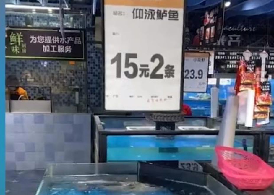 這起事件發生在廣東省清遠市某間超市,根據目擊者拍攝影片顯示,在一家超市生鮮區,魚池價格牌上標註,「仰泳鱸魚15元2條」。