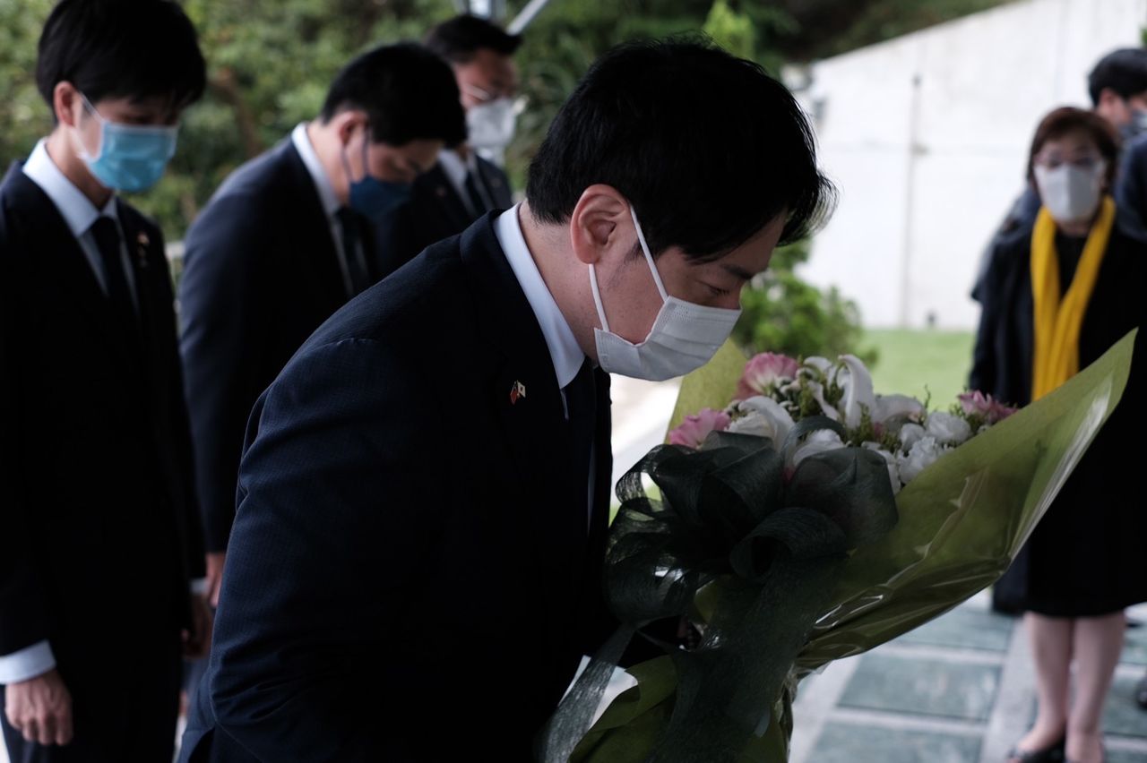 ▲自民黨青年局局長小倉將信(OGURA Masanobu)近日率團訪問台灣,訪團4日前往五指山國軍示範公墓特勳區,於前總統李登輝目前悼念。(圖/日本台灣交流協會)