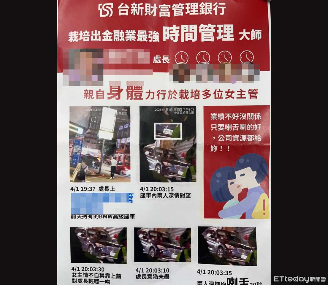 2021年4月26日中午,突然有2男子先後蛋洗台北市仁愛路上的台新金控總部,並在忠孝東路分行發送傳單,傳單上點名魏姓男主管涉嫌劈腿4位女性主管,圖文並茂標註魏男與4女分別約在咖啡廳吃早餐、還去旅館住宿,車內擁吻,以及民宅中性愛照,傳單文字諷刺該魏男是「金融業最強時間管理大師」。