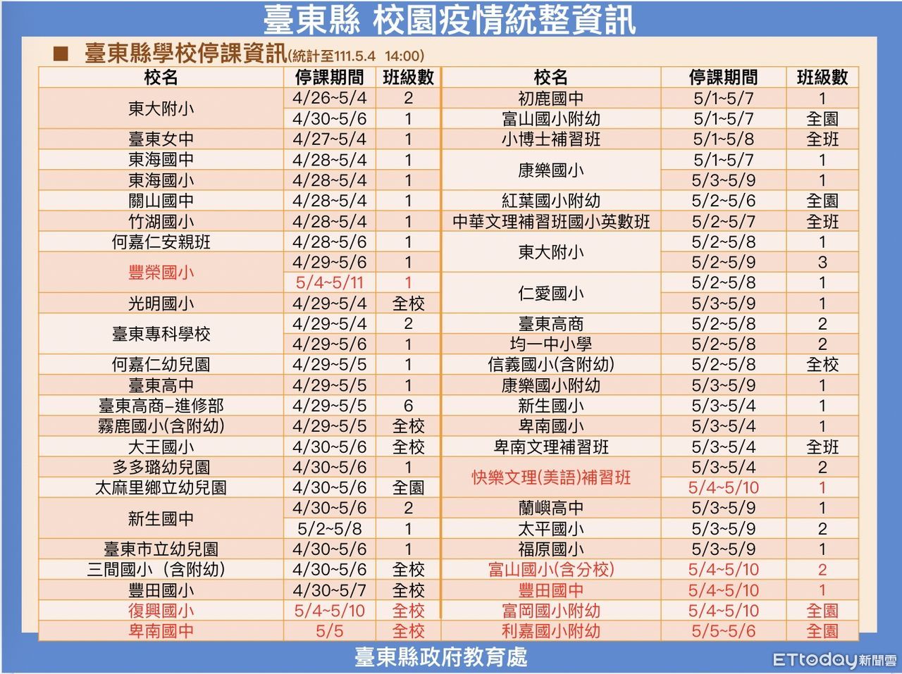 今日校園新增13生、2師確診,至今日為止累計共181生、14師。在調整或新增暫停實體上課學校部分:富岡國小附幼全園延長停課至5/10、快樂文理(美語)補習班1班延長停課至5/10、豐榮國小1班級延長停課至5/11、復興國小全校停課至5/10、豐田國中1班級停課至5/10、富山國小利吉分校1班級停課至5/10、卑南國中全校停課至5/5、利嘉國小附幼停課至5/6。