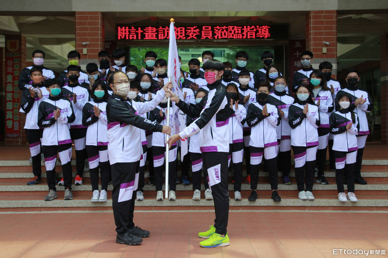 ▲中華醫大全國大專院校運動會代表隊接受校長孫逸民(左)授旗。(圖/記者林悅翻攝,下同)