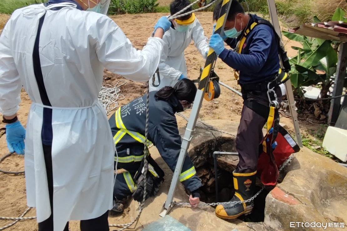 ▲金門一名婦人昨(4日)因不明原因跌落農田中的水井,救護人員趕到現場,垂降入井將婦人救出並施行急救。(圖/記者林名揚翻攝,下同)