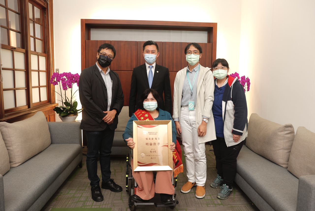 今年62歲的吳美金女士,榮獲今(111)年竹市模範母親,由林智堅親頒紅彩帶與賀匾。她憶起與市長相識經過,吳女士說,2014年市長正在謝票,她恰巧坐輪椅路過,原以為僅擦肩而過,市長卻特地向她問好,這幕令她至今記憶猶新,從此變「小智粉絲」。