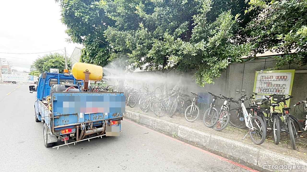 ▲桃園市政府環保局5日下午派員針對某工廠確診移工宿舍周圍清消作業。(圖/記者沈繼昌翻攝)