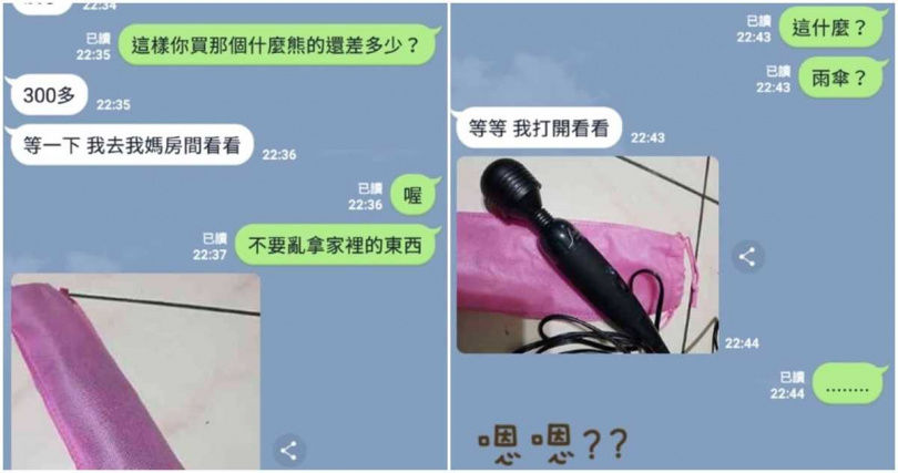 後來小妹妹沒東西可以賣了,靈機一動跑去媽媽的房間找出可以賣的東西,接著就傳了一張照片給原PO,看起來像摺疊傘的棒狀物體,外層還有粉紅色的袋子。男網友提醒她,「不要亂拿家裡的東西」,沒想到小妹妹打開套子後,竟然是媽媽的按摩棒,按摩棒有著黑色的外觀,小妹妹似乎不知道自己拿的是情趣按磨棒,天真的繼續推銷,「這個好像要插插頭的,200可以嗎?」讓男網友覺得傻眼又好笑。
