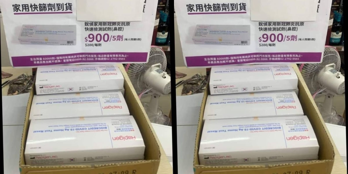 一名男網友在臉書《基隆人》表示,稍早路過美廉社時,發現有販售「銳偵家用新冠肺炎抗原快速檢測試劑(鼻腔)」,每人限購5劑也就是一盒,售價為900元,等於一劑180元;若要單劑購買,一劑價格則為200元。