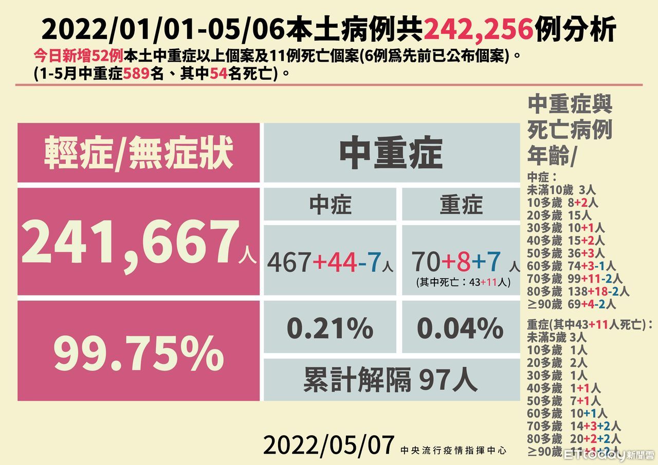 根據指揮中心統計,今年1-5月共累計24萬2256人確診,589名中重症個案,其中54人死亡,累計97人解除隔離。輕症佔比99.75%、中症0.21%、重症0.04%。指揮官陳時中表示,隨著病症越來越多,重症的比例會稍微提高。