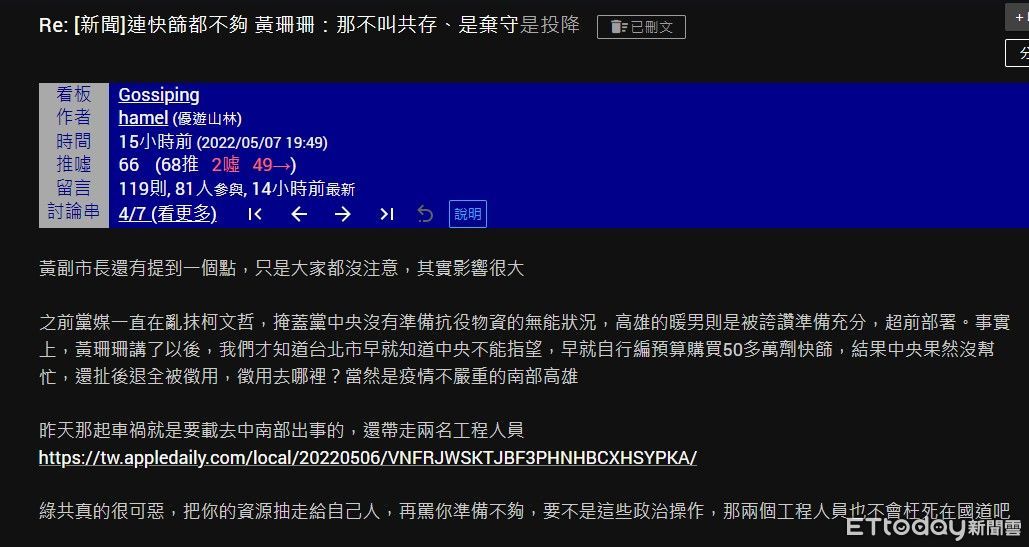 高市刑大指出,7日夜間透過社群平台PTT散布「5月6日那起車禍就是要載去中南部出事的,還帶走兩名工程人員」的貼文,內文提到車禍貨車載運的50萬劑快篩,是中央徵用要運給高雄市,讓高雄市府200位公務員採購4萬劑快篩,可打6個月且免費等內容,經查證貼文陳述的內容與文中所引用的交通事故新聞報導,完全不符,屬於有心人士杜撰言論。