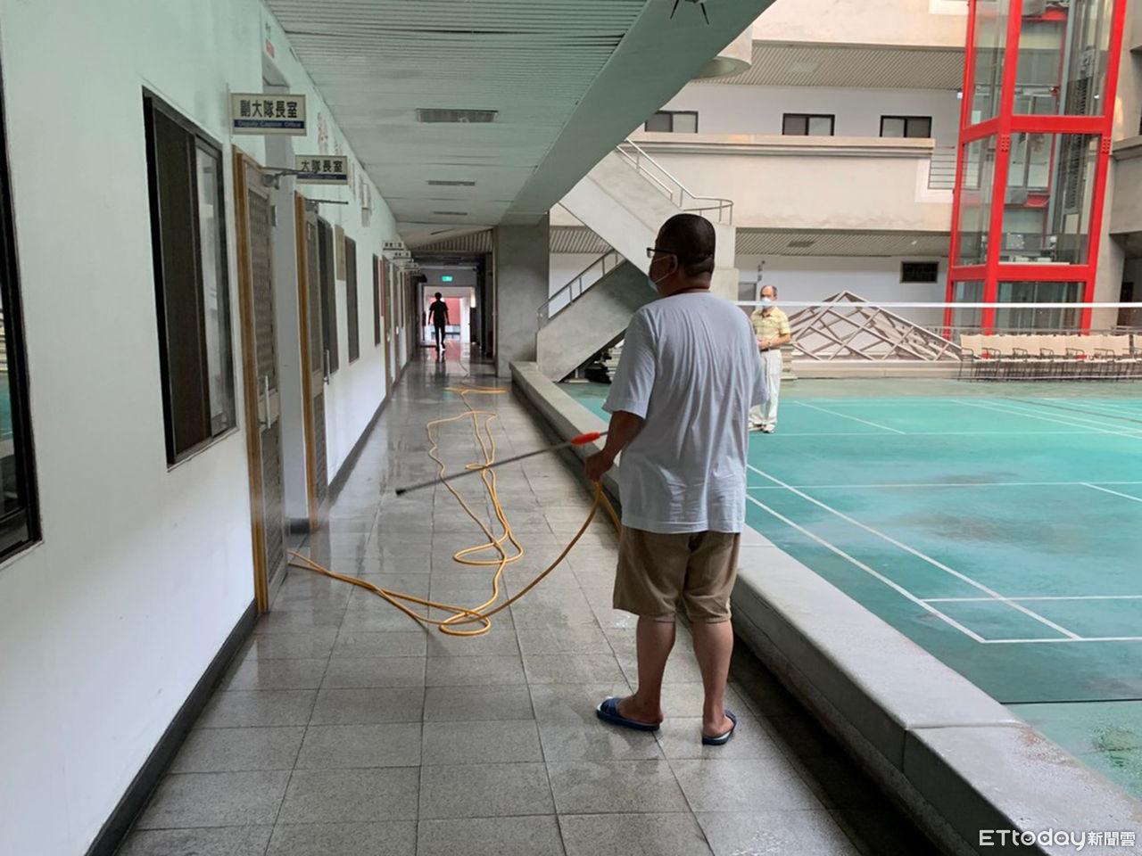 ▲雲林縣警局刑警大隊2組辦公室共6人確診,清潔人員加強清消。(圖/記者蔡佩旻翻攝)