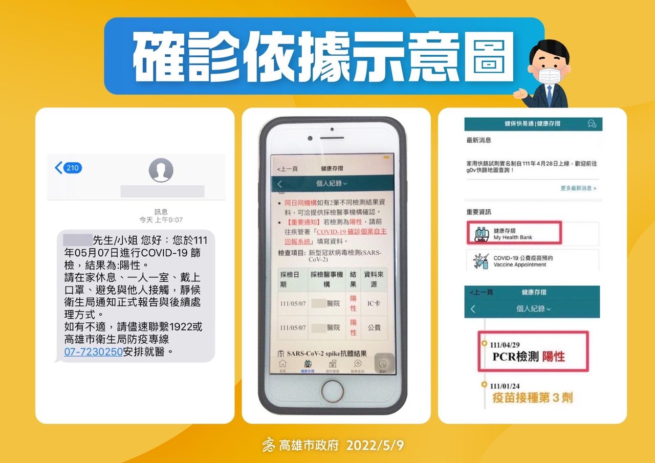 高雄市簡化確診請假證明文件,高雄市受雇勞工有4種依據可當作請假證明,採檢醫院簡訊通知、個案隔離治療通知書、健保快易通APP檢測結果、高雄市衛生局確診通知簡訊。勞工只要擇一證明,即可選擇對自己有利的假別請假,包含特別休假(全薪)、普通傷病假(半薪)、事假(無薪)。
