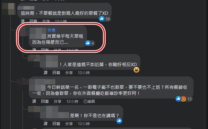 一名在醫院工作的網友直接留言,「拜託,買回家自己吃就好,儘量不要群聚,我在醫院上班,醫護確診隔離,其他要多扛班的已經快累垮了,有的懷孕也還在排班,因為人力不足,有醫護已經累到要離職了,住院病人已經快沒人顧了,拜託,自己吃就好,非常時期非常做法,沒想當正義魔人,但醫護真的很可憐,醫護也有家人,好嗎…」,而該則留言也獲得2000多名網友按讚。