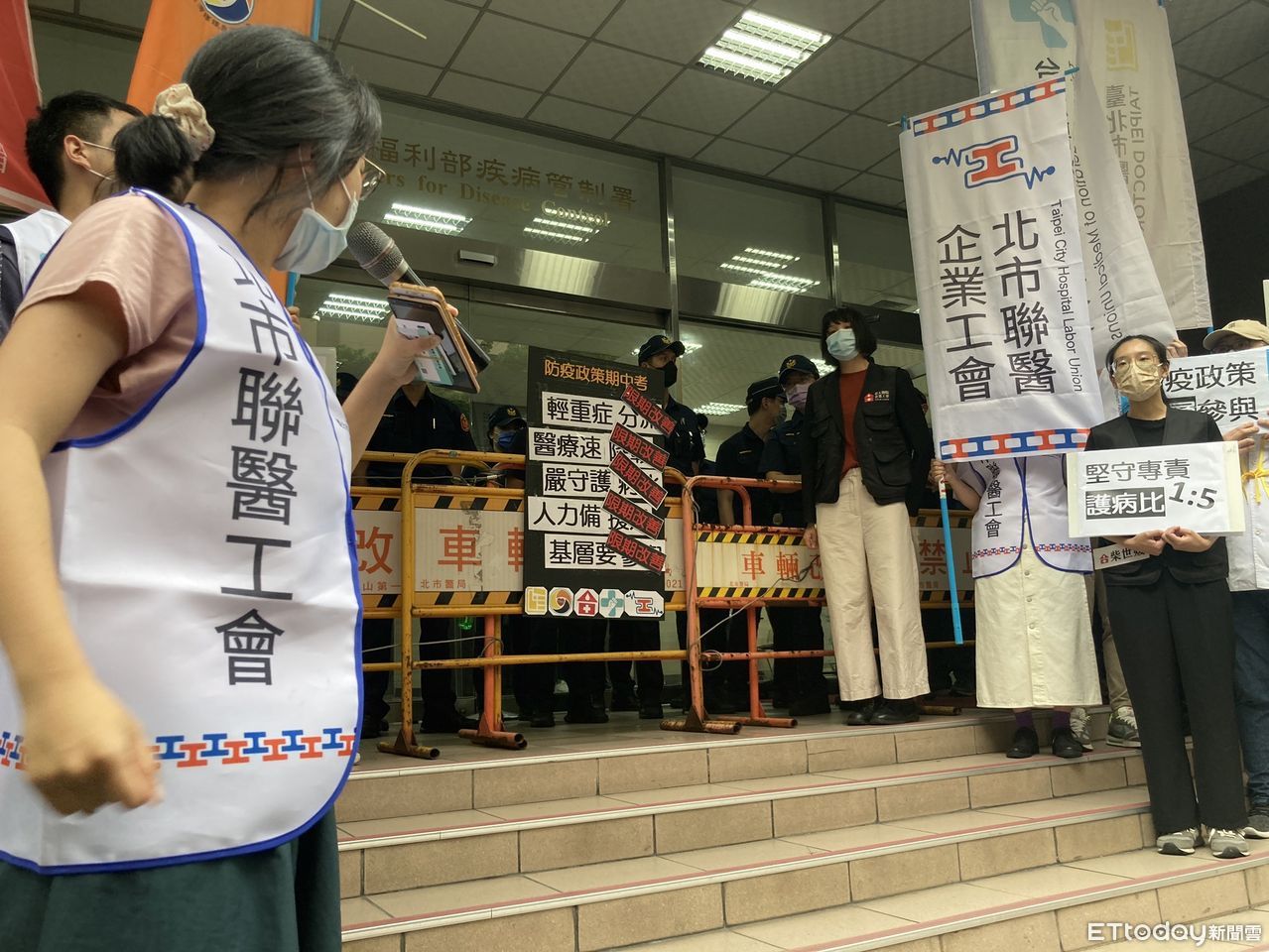 ▲北市聯醫企業工會至疾管署前抗議。(圖/記者洪巧藍攝)
