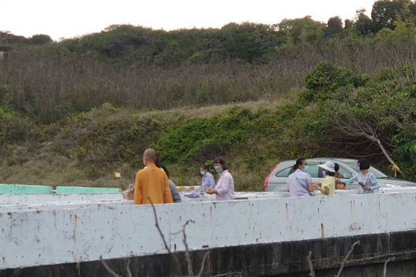 墾管處接獲檢舉,函請保七總隊第八大隊追查,警方找到法師及信眾,他們承認朝海面吐土司,表示想累積功德,不知不可以朝海面丟吐司,警方依規定開單告發。