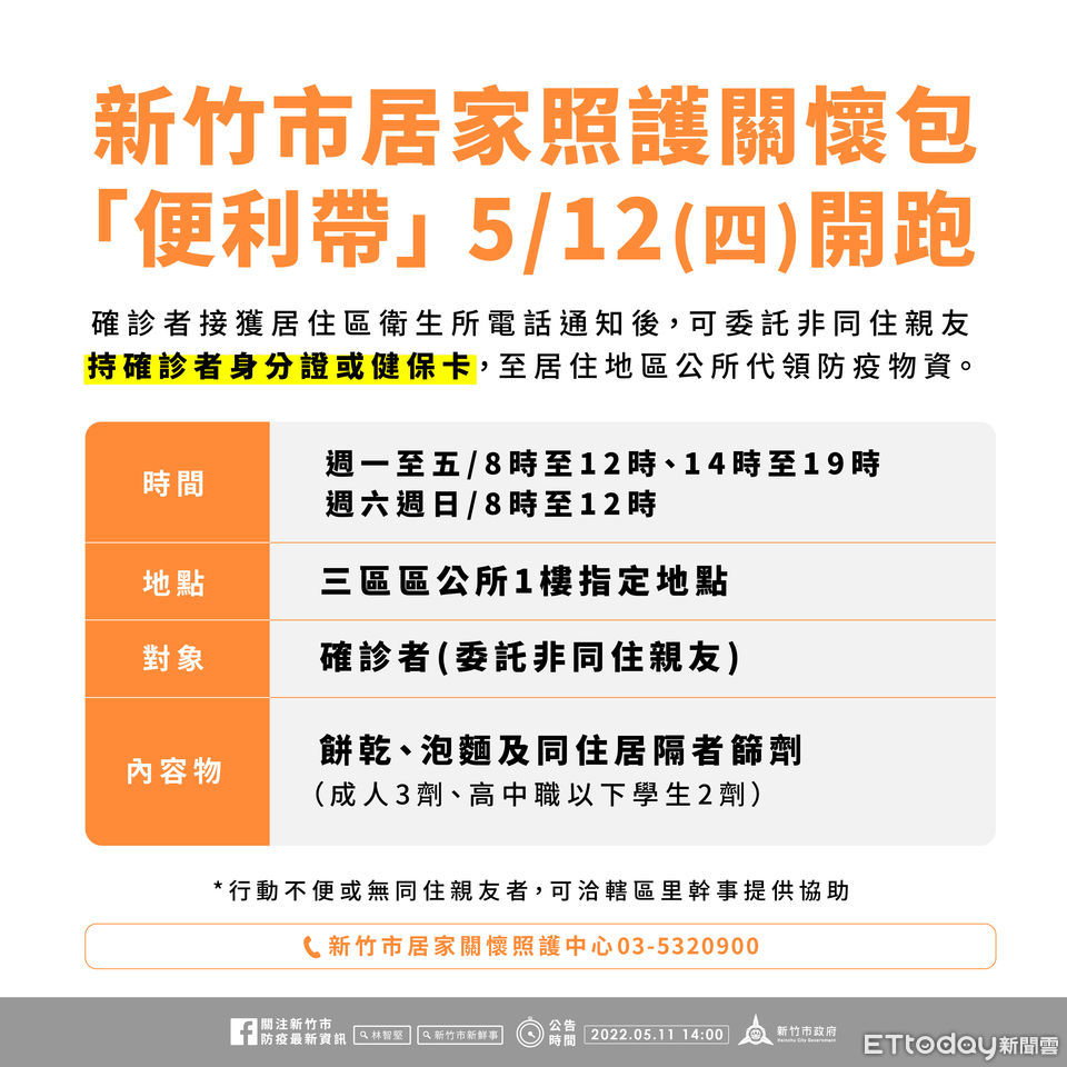 新竹市府今(11)日宣布,12日起開始啟動「確診關懷包便利帶」服務,開放「確診者」親友至區公所代領防疫物資,確診者之同住者的快篩試劑(成人3劑、高中職以下學生2劑)也可一併領取。只要確診者接獲衛生所關懷電話通知或收到CDC門號0911-514588發送的確診簡訊,即可委託親友至居住地區公所領取關懷物資,即領即用最便利!