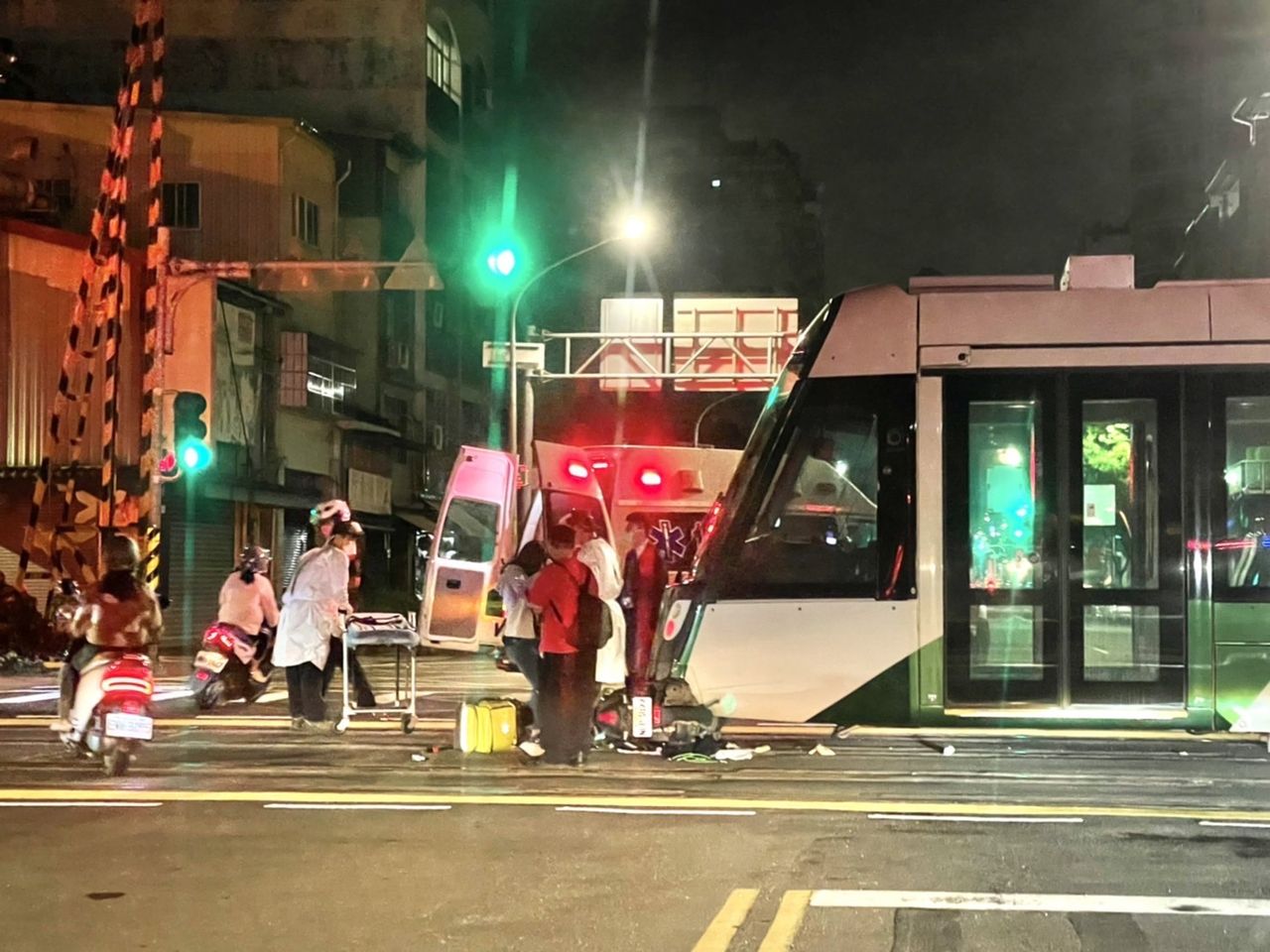 輕軌司機員立即緊急停車,所幸該列車是回收機廠的空車,車上無乘客、也無影響正線營運。機車騎士則手腳有輕微擦傷,已由救護車送往醫院。