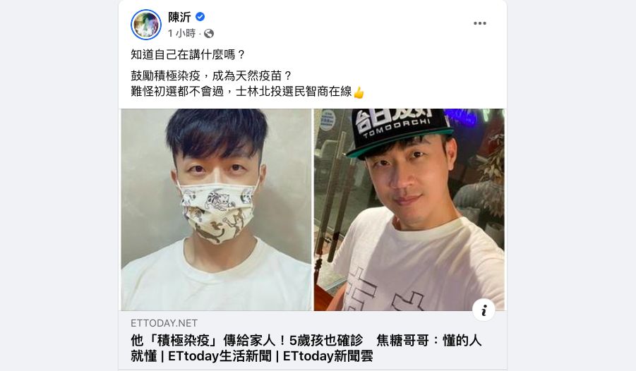 民進黨台北市議員初選敗陣的「焦糖哥哥」陳嘉行11日自爆確診,有網友在其臉書下分享「積極染疫」後達到全家人免疫的的自身觀點,而陳嘉行也認同並回應「懂的人就懂」,遭網友罵翻。對此,網紅陳沂12日諷刺,「難怪初選都不會過,士林北投選民智商在線」。