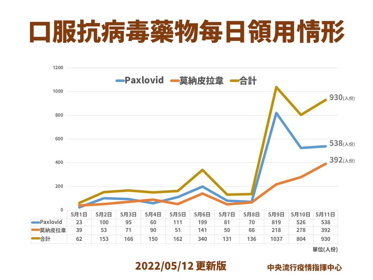 快篩陽性等同確診今(12)日上路,指揮中心明起另開放確診者親友到124家「配賦醫院」防疫門診掛號看診及領藥。指揮官陳時中公布口服藥物使用情形,昨日共使用930份,輝瑞Paxlovid發出538份、默沙東莫納皮拉韋發出392份,現在輝瑞佈點很多,下週起會擴大莫納皮拉韋藥物發配,更方便民眾取藥。