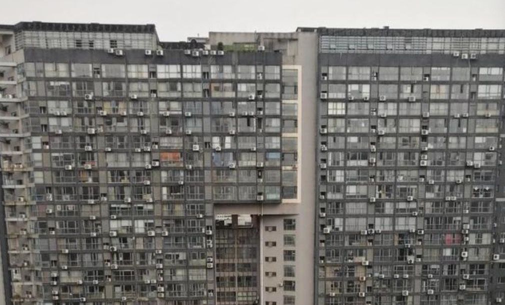 從外觀看整棟大樓,都是密密麻麻的住戶,原本17層頂樓建了一整排建築物,乍看以為是原生樓層,實際上都是違法加蓋。這些多出來的建築物已經超出大樓當初設計結構係數,存在很大隱患,居民擔心有塌樓危機。